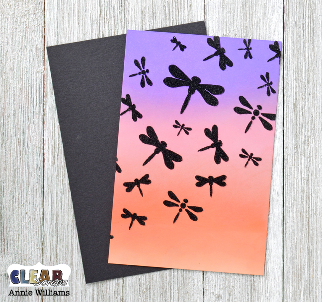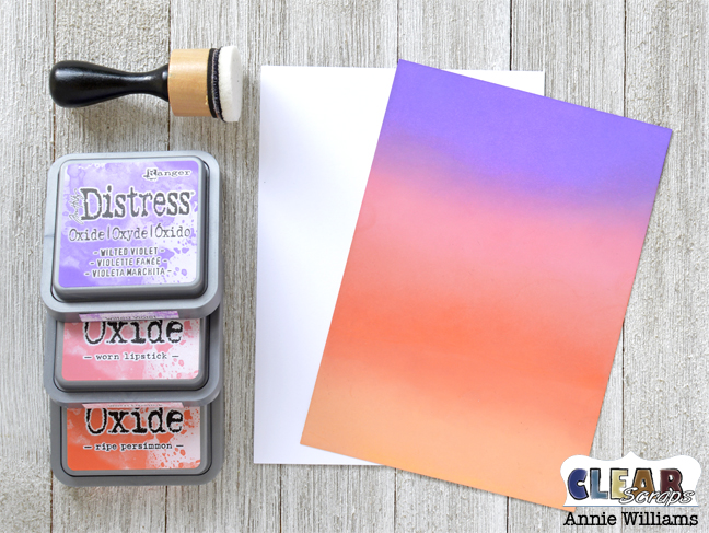 I started by inking a 5" x 7" panel of white cardstock with purple, pink, and orange inks using a foam blending tool.