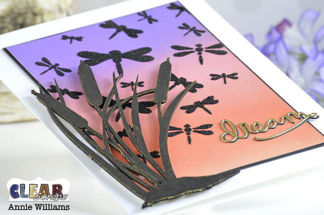 After adhering the matted background panel to the center of a 5" x 7" white card base, I added the cattail embellishment to the lower left corner with foam adhesive. The sentiment was die cut from some gold and black cardstock and adhered to the lower right corner with liquid glue.