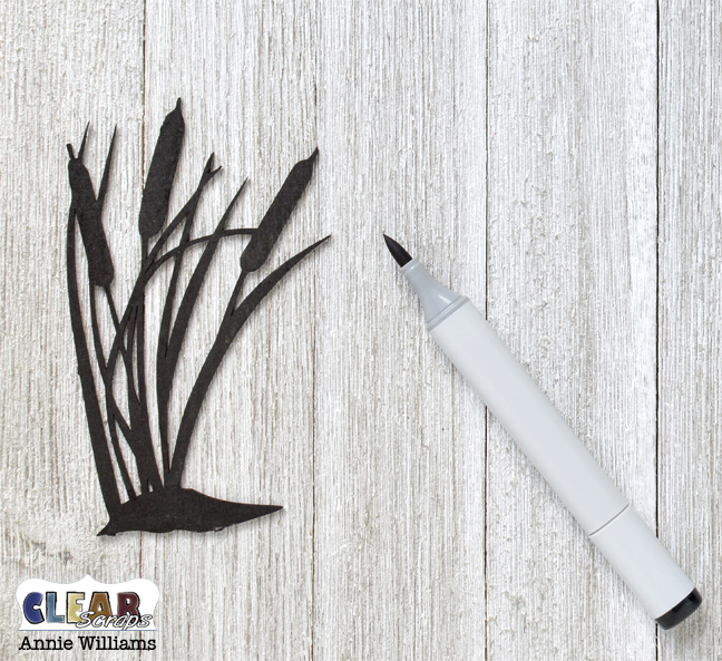To color the Cattails Chipboard Embellish, I simply added a few coats of ink from a permanent black marker. For a little added dreaminess, I also lightly brushed gold gilding wax over the edges of the piece with my finger.
