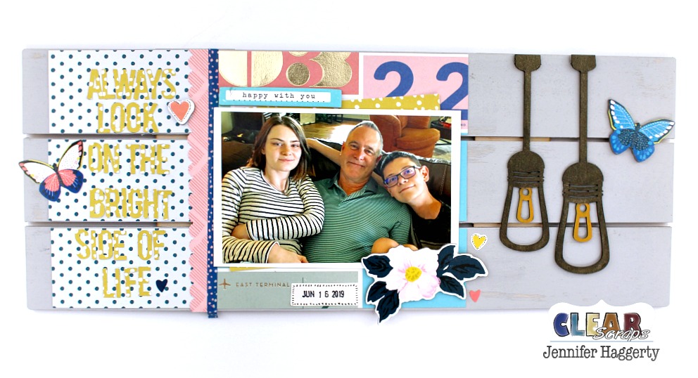 I adhered 3 two inch sections of patterned paper for my title, as well as for my photo to fit the slats of the pallet. Using a favorite cut file and yellow print, I adhered my title to the navy polka dot background. I also added stickers and chipboard from the collection I used.