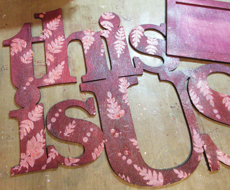 Once dry, I used the 6" Fern Stencil to add designs about the panel with modeling paste.