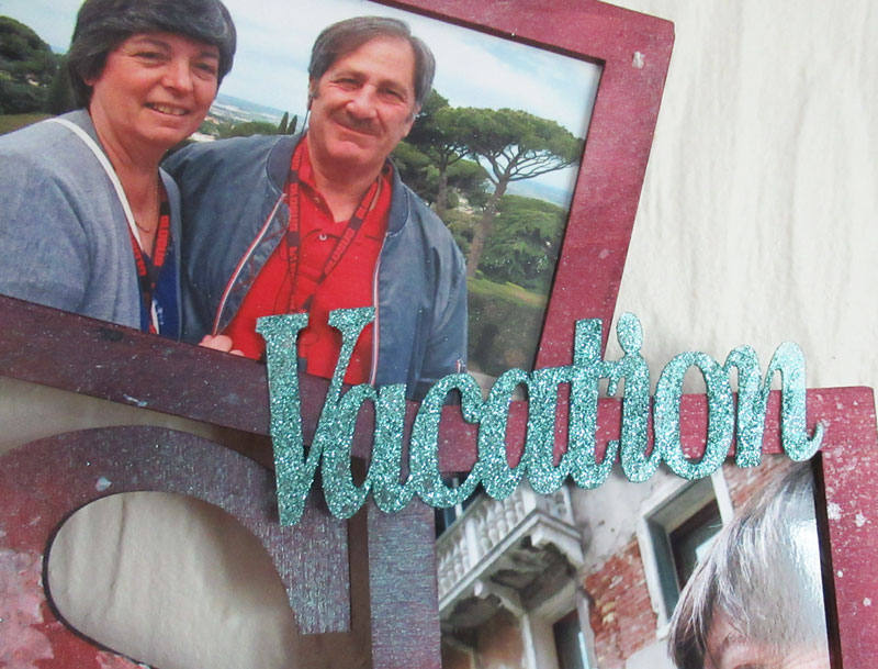 Using the Expressions Small Vacation Word Title, I first removed the protective film and added glue. Then I poured on Stampendous Glitter and allowed it to dry.