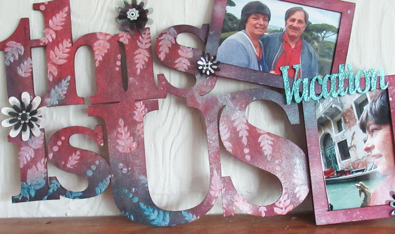At approximately 19" x 12", this is a fun way to showcase several theme related photos. I slipped in 2 photos – each 4 1/2" x 6" – and adhered the edges with wood glue. You can even use glue dots or velcro dots if you want to be able to swap out the photos at some point.
