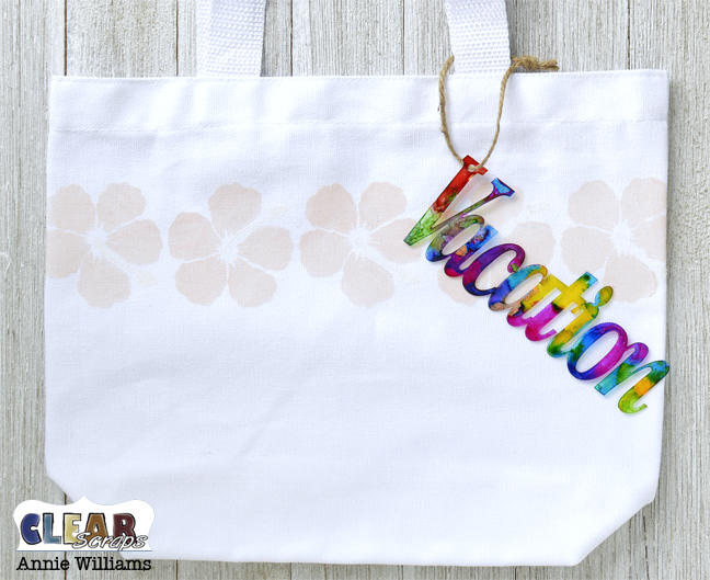 Hi there! It's Annie, and today I'm sharing a quick tutorial to make this fun color-changing tote bag that's perfect for summer travel using one of the border stencils and a clear word title from Clear Scraps.