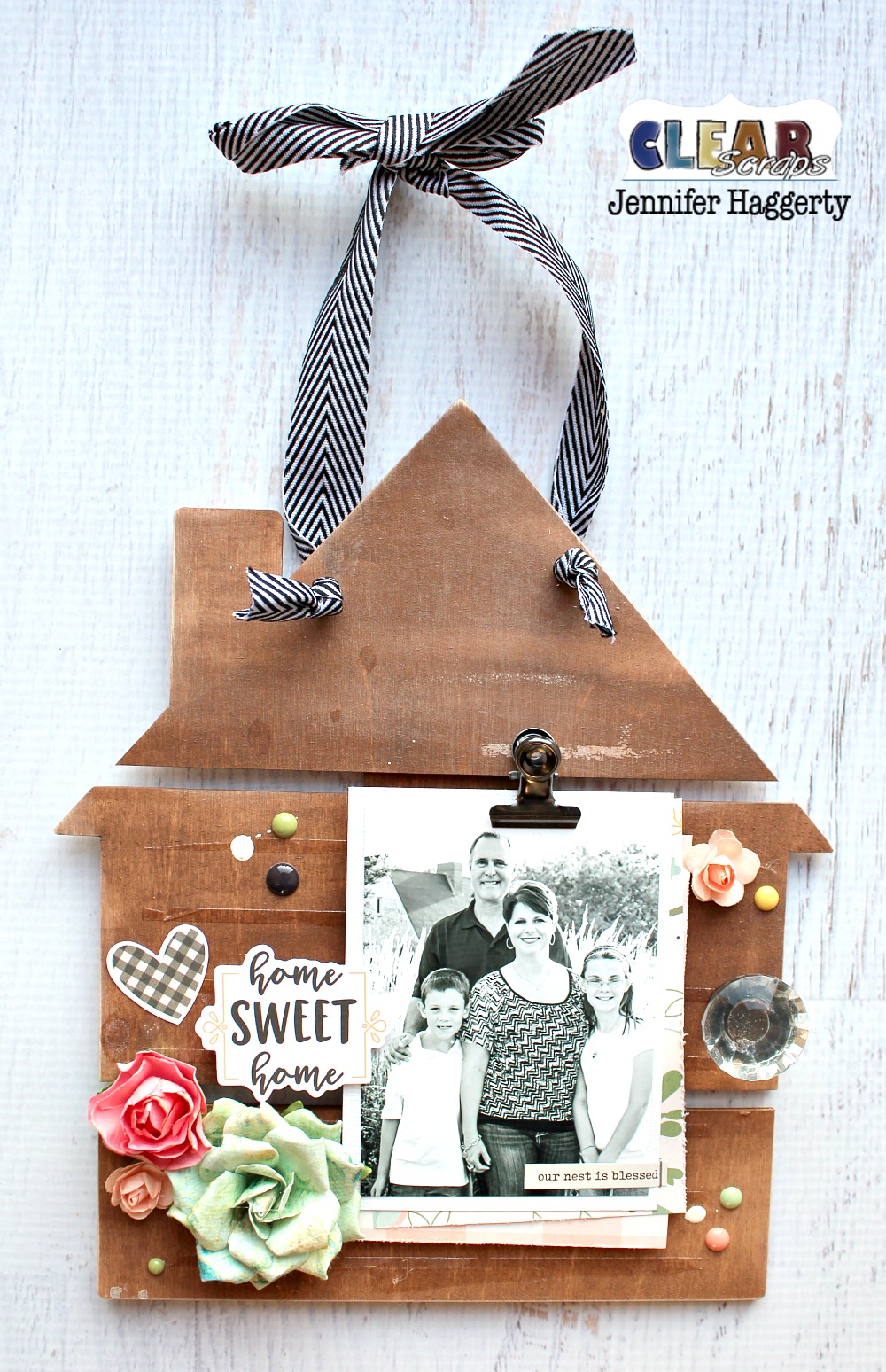 My pallet was then ready to decorate! I trimmed a favorite family photo down to 3×4 inches and matted onto white cardstock. I layered two pieces of patterned paper underneath my photo and adhered the entire piece using foam tape. I then secured a metal clip to the top.