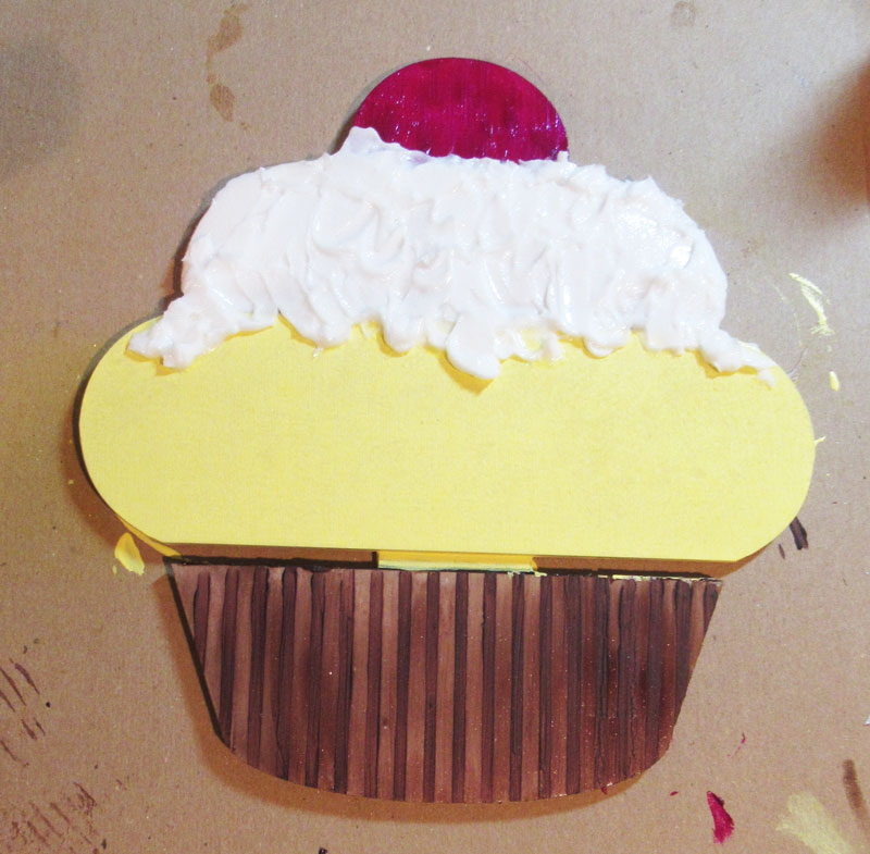This cupcake pallet is composed of 1/8 birch wood and measures approximately 8" x 8". I painted the cupcake base with brown paint, then taped off each section before painting the rest of the pallet.