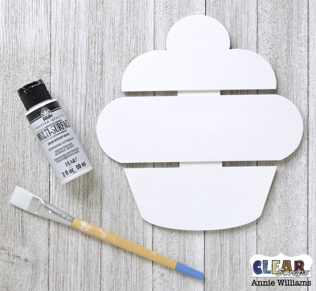 I started by painting the entire Cupcake Medium DIY Pallet Shape white with satin finish acrylic paint. Before I add my first coat of paint to wooden shapes like these, I usually give the whole piece a quick sanding with a fine grit sanding sponge. I repeat this sanding step after the first coat of paint, and then add a second coat. This gives it a really nice smooth finish for adding hand-painted touches later.