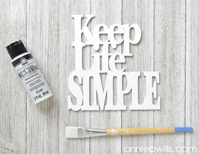 Because the pallet was so bright and textured, I decided to paint the "Keep Life Simple" wood quote a smooth white with acrylic paint. Two coats with a light sanding in between resulted in a nice finish.