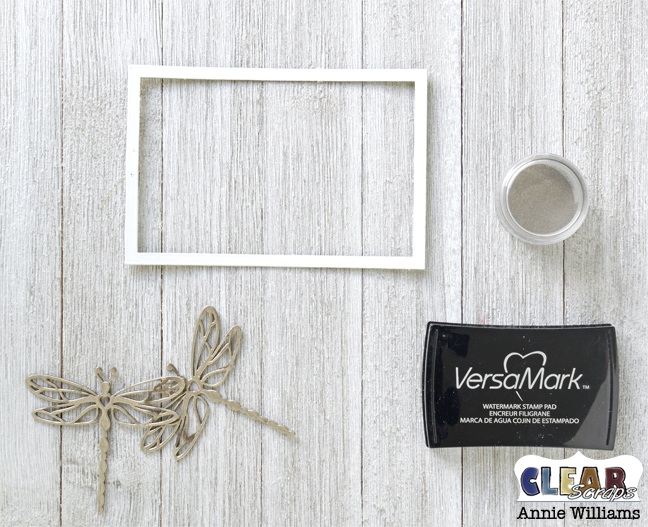 The photo frame on my pallet is actually just the border (packaging) from the dragonfly chipboard embellishment. Once I clipped the dragonflies out of the packaging, I cleaned up all of the edges with scissors and my sanding sponge. Then I applied Versamark Ink all over the chipboard pieces, added white or platinum embossing powder to the frame or dragonflies, respectively, and melted it with my heat tool. A second coat of embossing powder to all of the pieces ensured a smooth and sturdy faux enamel finish.