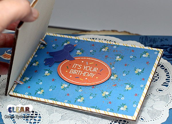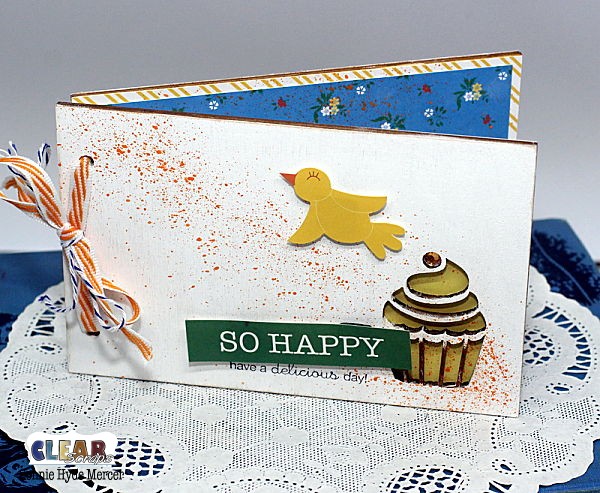 These wood cards are fun to create and so super cute!! This one was painted and pattern paper was adhered to the inside of the card. The pattern paper shows through the cutout cupcake, that you see on the front of the wood card. Stickers and stamps were used to decorate the front of the card. My crop-a-dile was used, to punch holes in the wood, so ribbon could be used, to tie the card together.