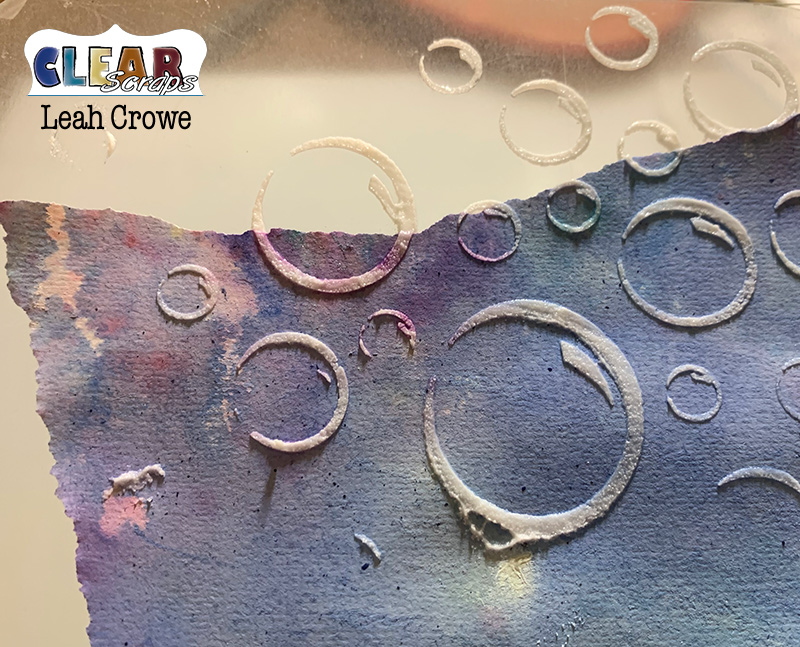 I started by using white cardstock, gesso, and spray inks to create my background. I adhered that to the 12×12 acrylic sheet, then masked the 6" Bubbles onto the background using course gel texture.