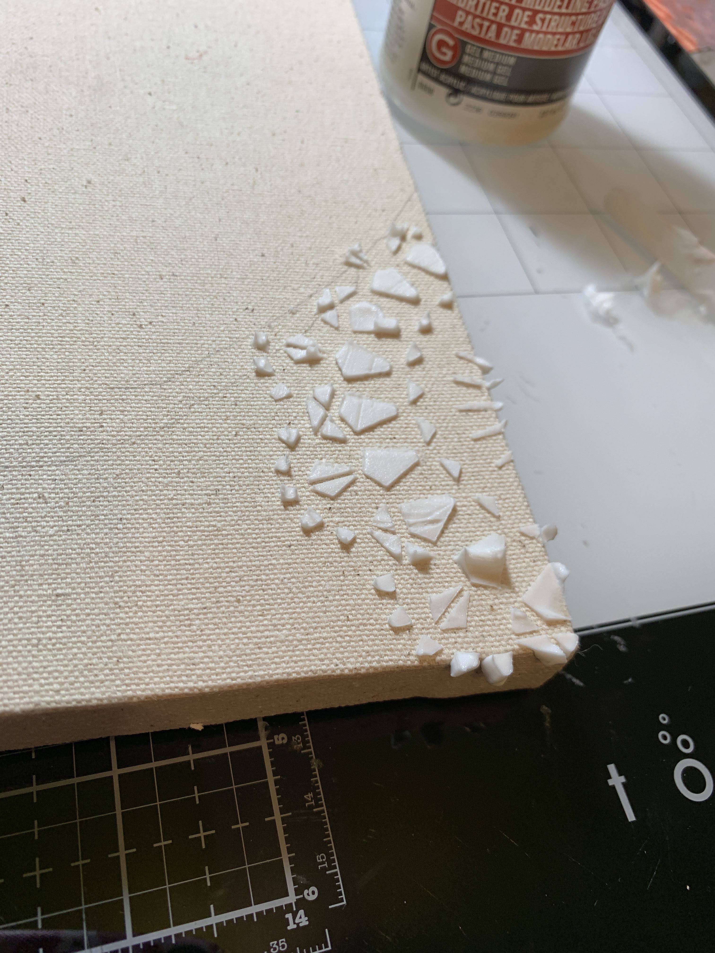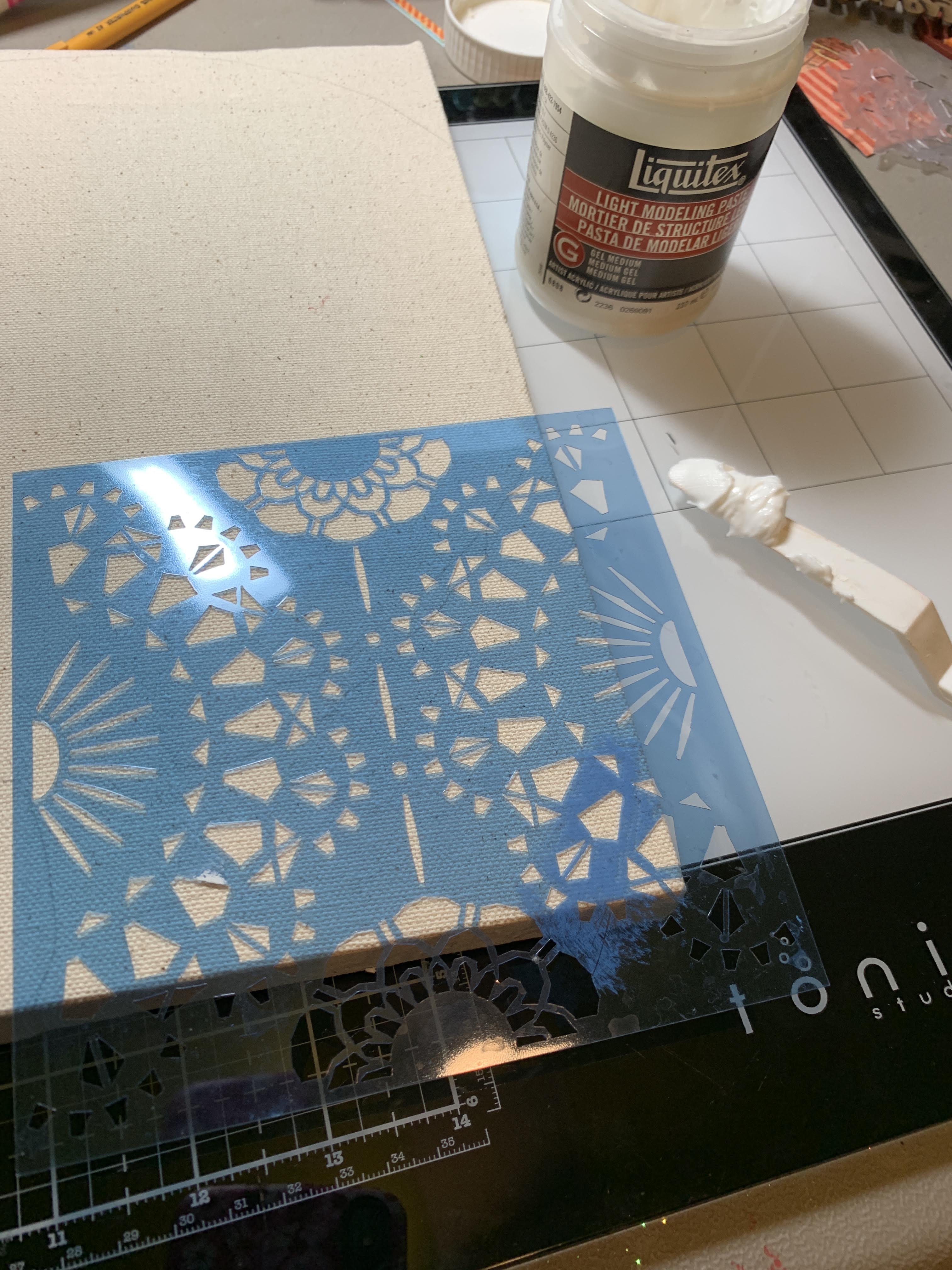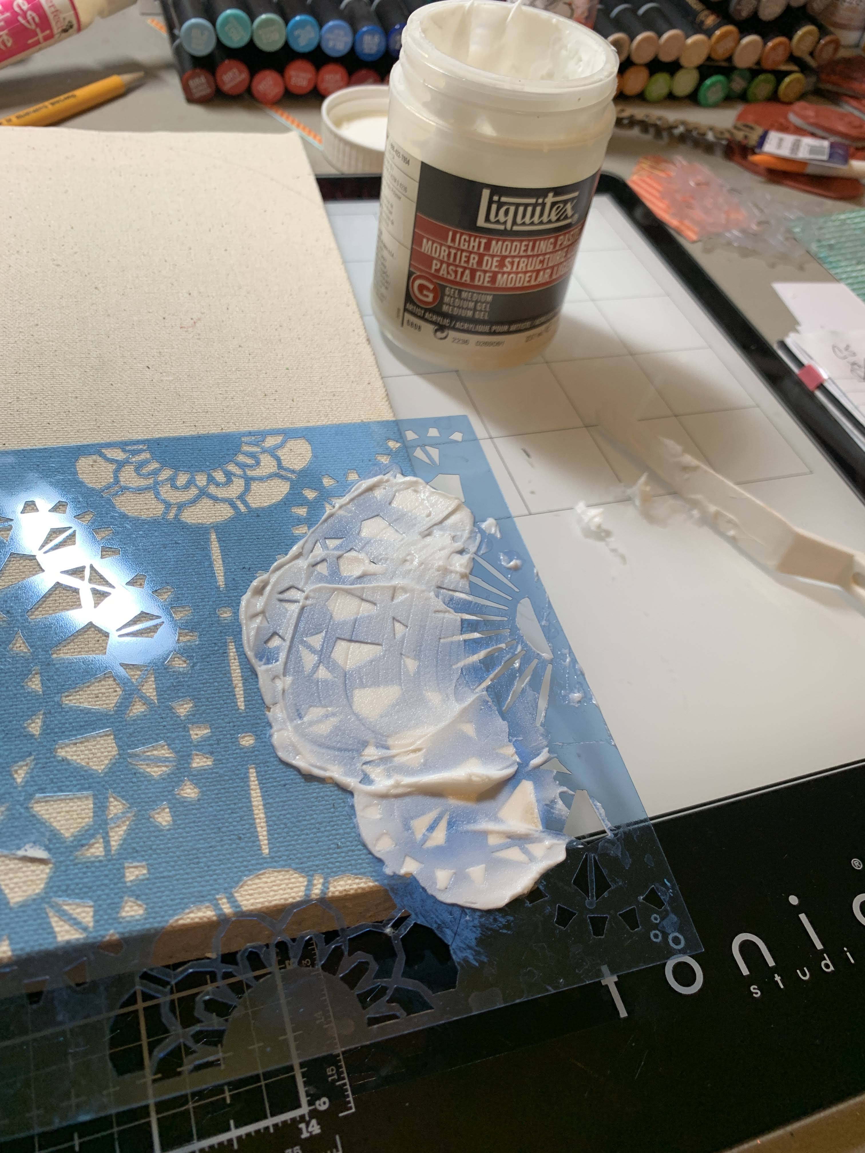 Using Clear Scraps 6" Doily masking Stencil, apply modeling paste onto canvas.