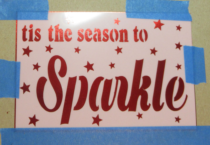 Using Rinea Foiled Papers, I taped the stencil in place. Using a spackle knife and modeling paste, I covered the stencil.
