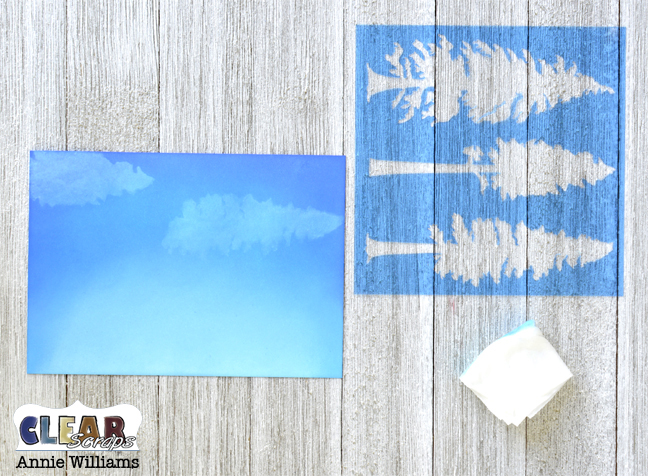 I wanted to create wispy cloud shapes but didn't have a stencil with the right look…until I realized that the 6" Pine Trees stencil looked just like wispy clouds when I turned it on its side! I dabbed a damp baby wipe through two of the tree shapes onto the inked background panel to create faint white cloud images in the sky.