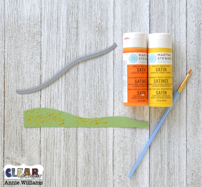 The hillside was die cut from some green cardstock with a wavy border die. I added speckles of orange and yellow paint to the die-cut under where I knew I would be placing my trees to give the ground a beginning-of-autumn feel.