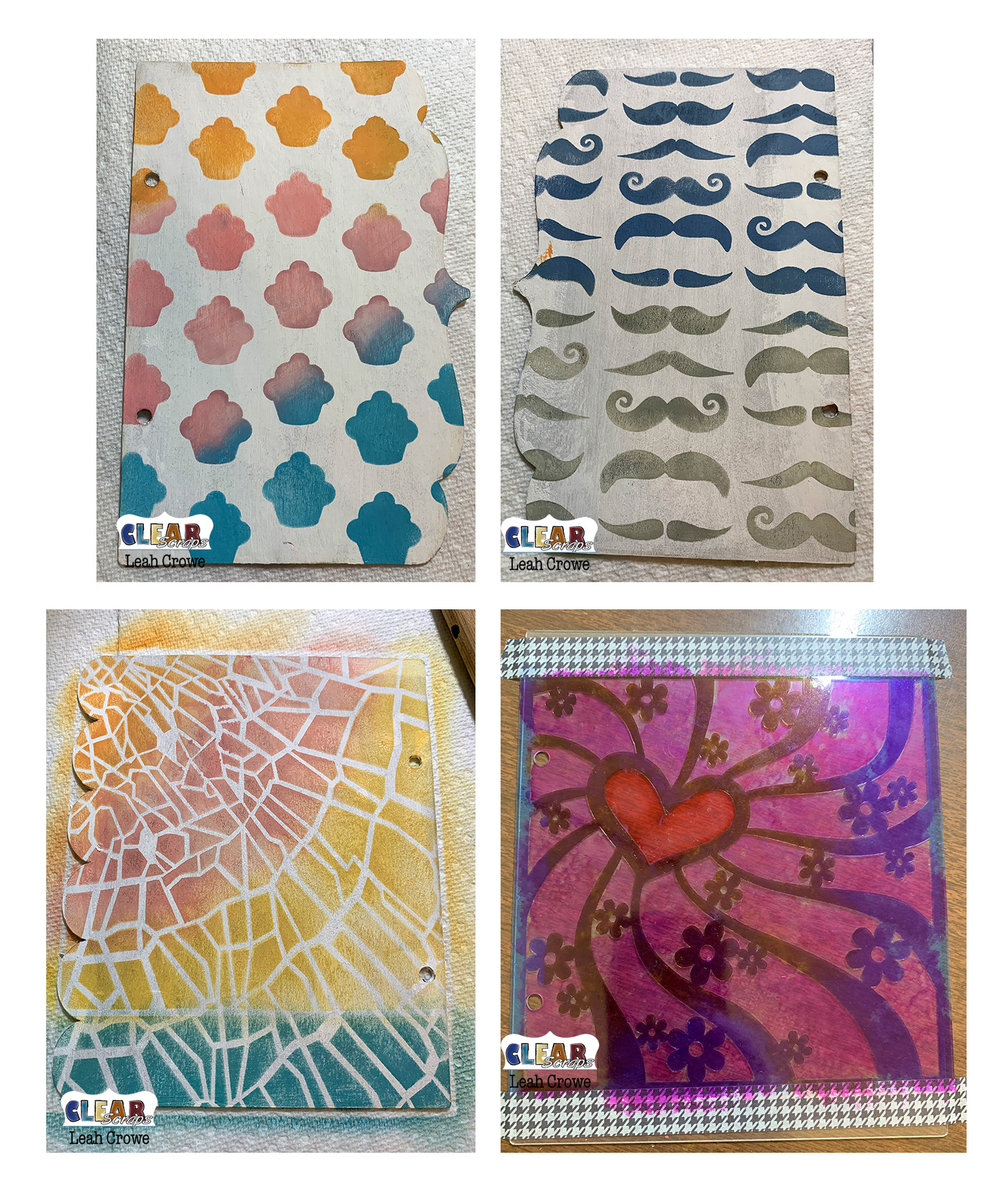 I used several of the 6" stencils on the chipboard pages in the album. I started by painting the album pages lightly in white, then I used distress ink and a brush to stencil on the pages. I also used alcohol ink and a stencil on the acrylic page. Here's a list of the stencils used as well as a peek at some of the pages before decorated and assembled.