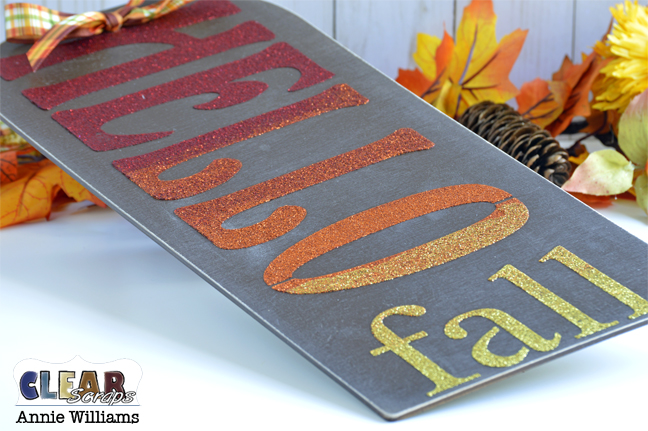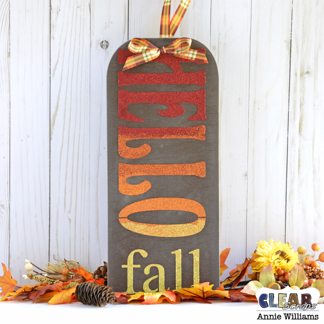 Hi everyone and happy first day of Fall! It's Annie, and today I wanted to share a quick tutorial to make this glittery autumn décor project using one of the new wood shapes and a gorgeous farmhouse stencil from the Clear Scraps shop.