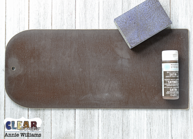I started by giving the Jumbo Wood Tags Rounded shape a quick sanding with my sanding sponge. Then, I applied two coats of brown acrylic paint over the entire tag. Once dry, I roughly sanded the piece with my sanding sponge, concentrating the heaviest pressure around the edges and in random small areas elsewhere for a distressed look.