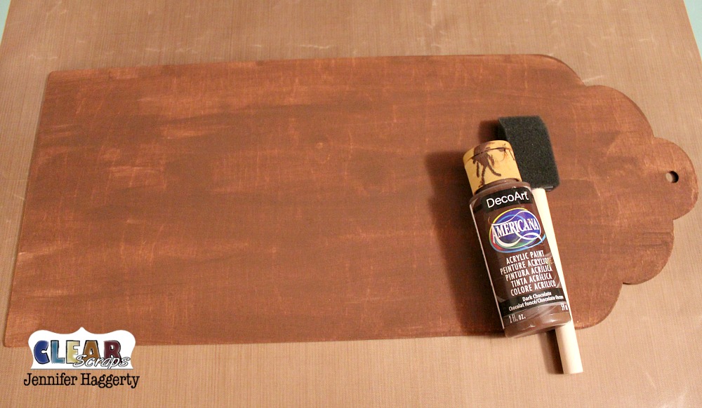 I began by painting my tag with brown acrylic paint. I did not apply more than one coat as I wanted the grain of the wood to show through. That is one of the many nice qualities about the birch wood is that it accept the paint very well.