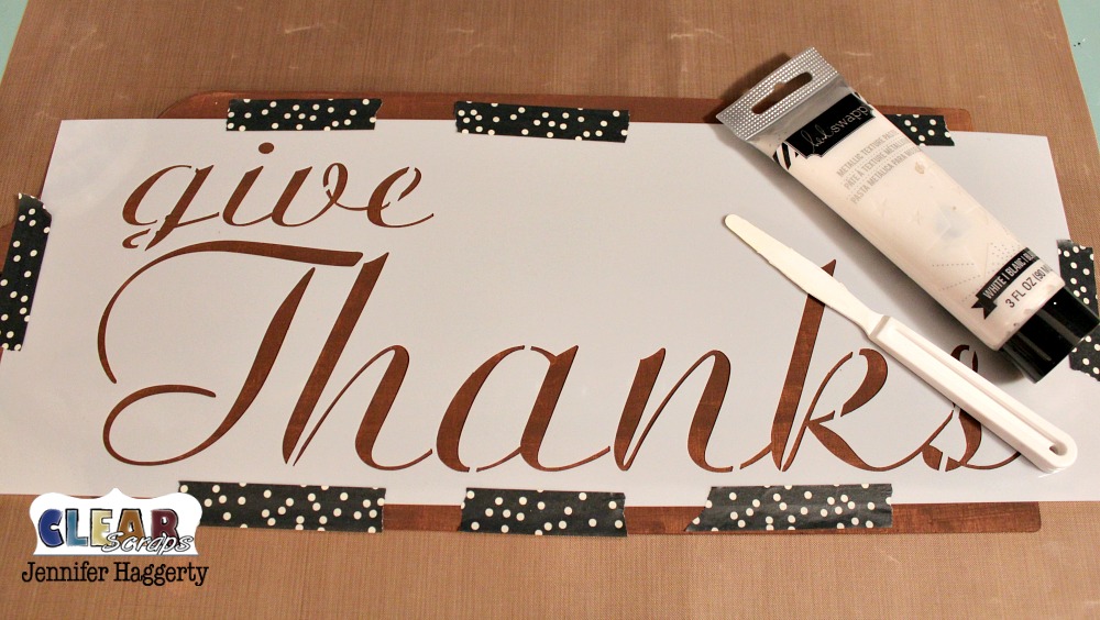 Next, using washi tape, I secured the Give Thanks 6×16 Farmhouse Stencil to the top of my tag. I selected white metallic paste to apply with a spatula. I was sure to add a thin layer ensuring to smooth with the spatula as I went.