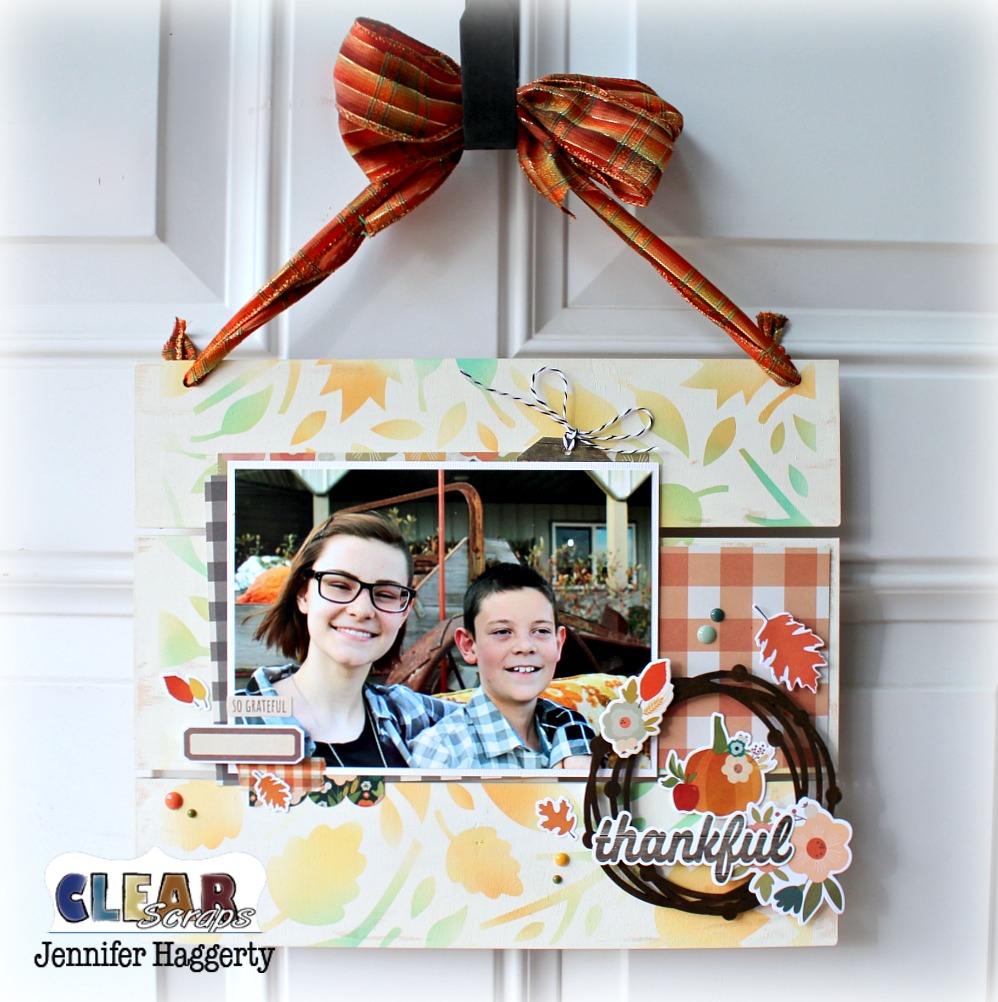 I finished by punching holes at the top of the pallet to string fall colored ribbon for hanging my project. Thank you for stopping by the blog today! You can find all of these products and much more by visiting the Clear Scraps shop! Have a great day!
