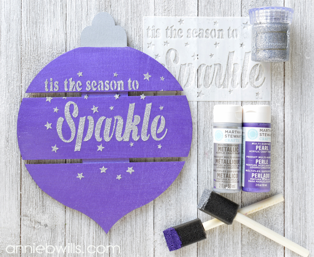 I started by giving the Bulb Medium DIY Pallet Shape a quick sanding with a sanding sponge. Then I applied two coats of deep purple pearl acrylic paint to the body of the shape and two coats of metallic silver acrylic paint to the hanger top using foam brushes. Once completely dry, I laid the 4×6 Sparkle stencil over the center of the shape, taped it down with light-tack painter's tape, and applied silver glitter gel through it with a palette knife. When I had a nice even coat of glitter gel applied, I removed the stencil and moved it further down the shape to add a few extra stars by stenciling just a small portion of the design.