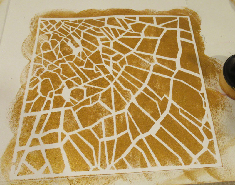 Using the 6" Shattered Glass Stencil, I placed it on white cardstock, then used gold metallic paste.
