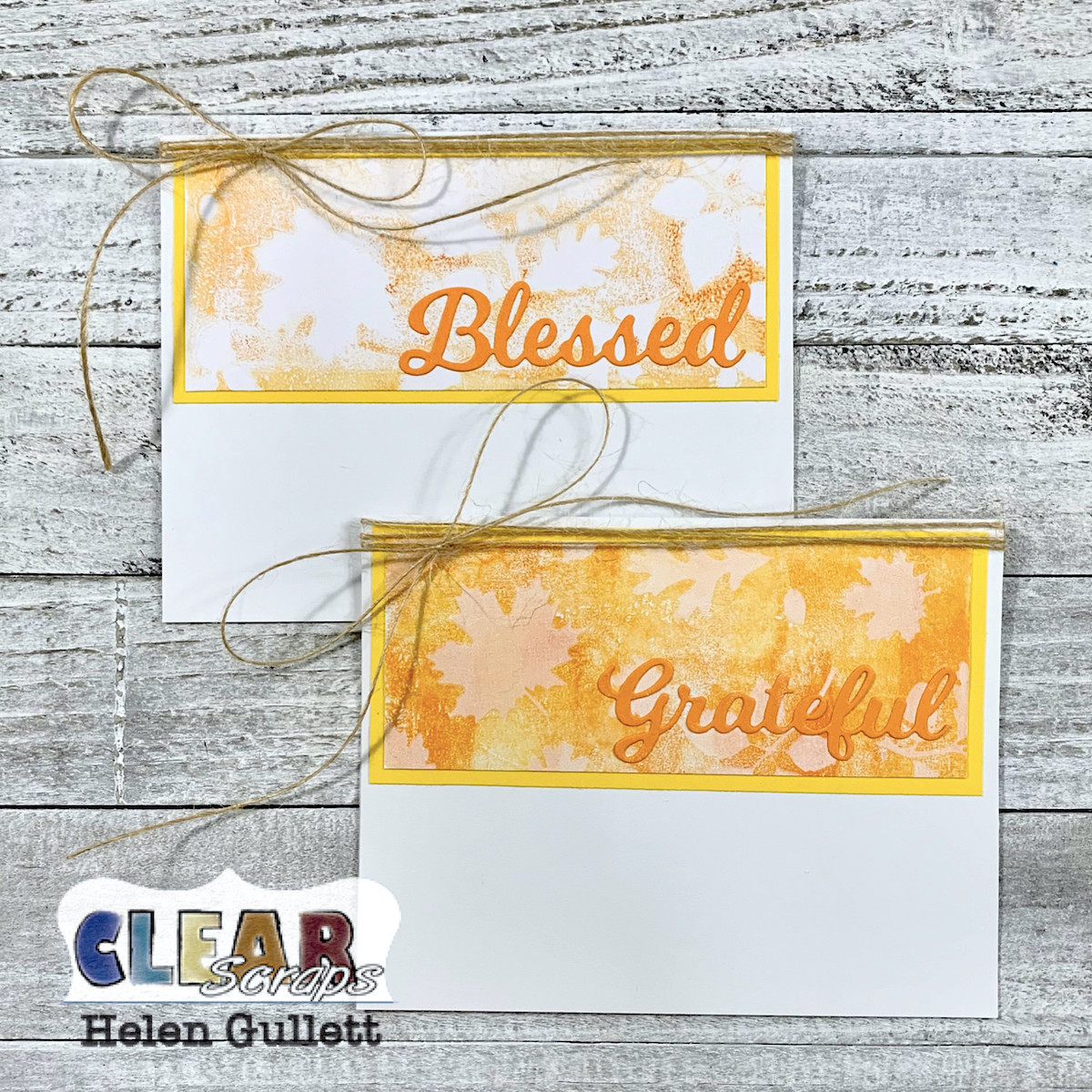 I cut out the words out of the orange cardstocks using the Grateful and Blessed word dies. I added the sentiments on the card with dries-clear glue. I embellished the cards with some natural burlap twine ribbon.