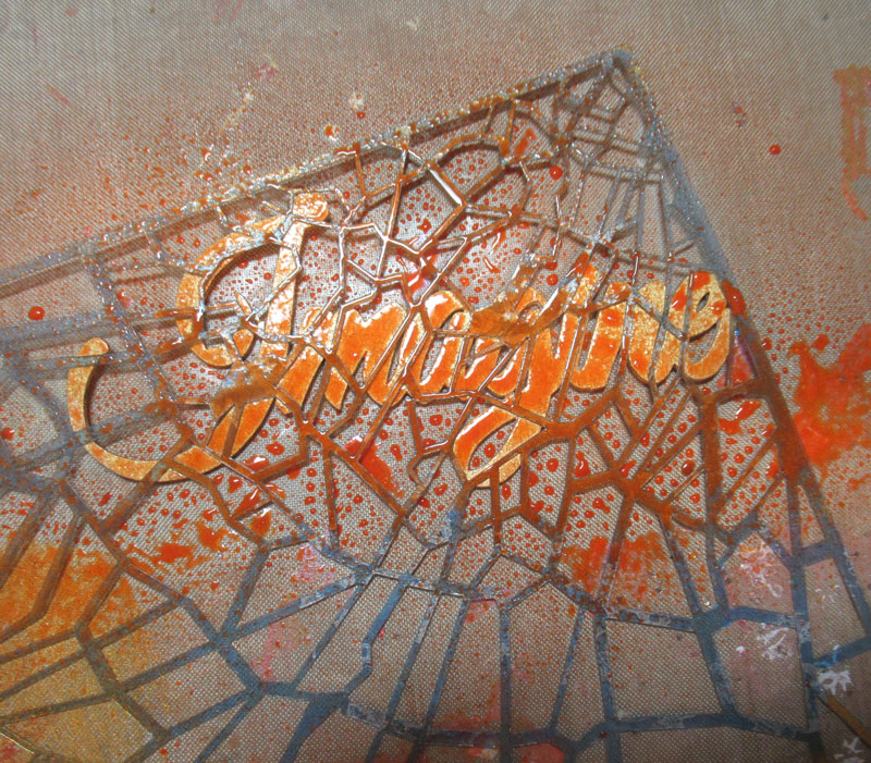 Placing the Shattered Glass Stencil on the chipboard word, I sprayed it with a craft spray.