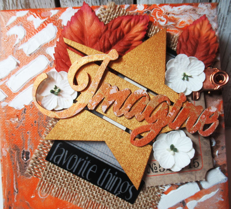 Hi everyone, Steph Ackerman here sharing a mixed media canvas using the Chipboard word title – Imagine – as well as the Mini Wood Pallet Star as the focal elements.