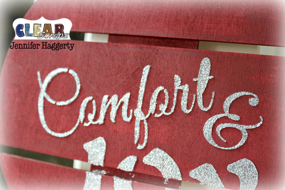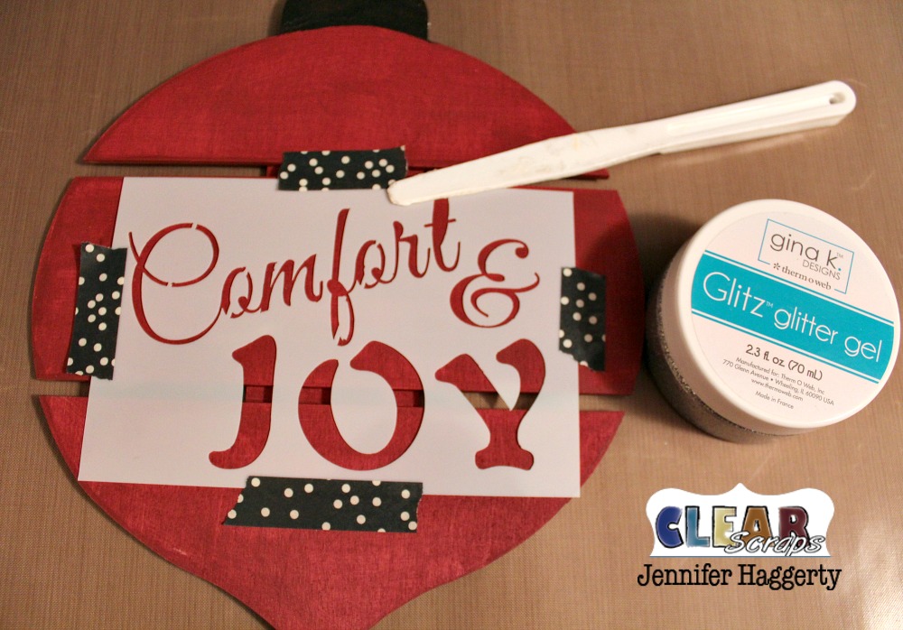 I secured the Comfort & Joy 4×6 Stencil to my pallet with washi tape. I then applied glitter gel in silver across the stencil. I found that sweeping a foam brush over the top of the stencil after the application helped to smooth out any bumps.