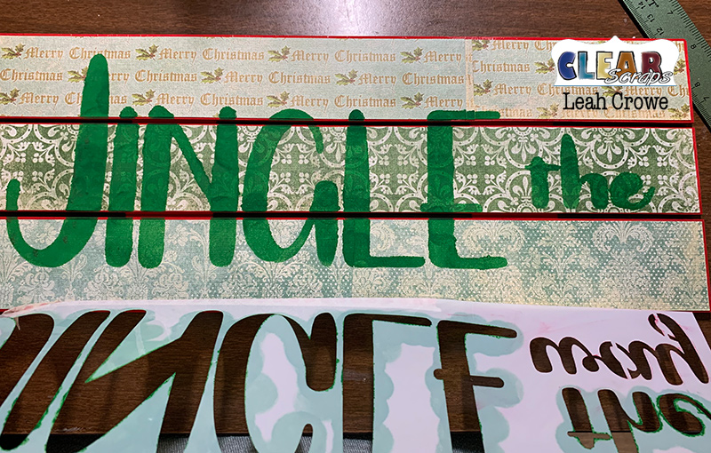 I also knew before I stenciled that I wanted to line up "all the way" part of the stencil inside each horizontal line. So I started by stenciling 'Jingle' and 'the', and then moved the stencil into the place where I wanted the other words to be.