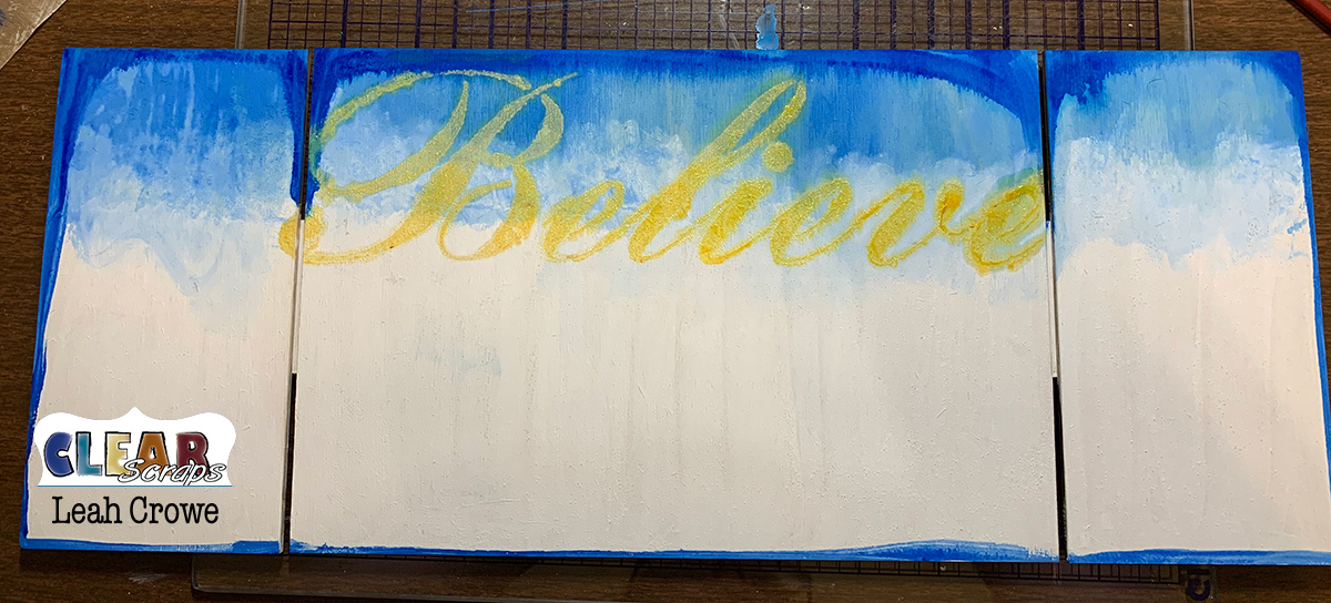 Once that dried I placed the Believe stencil down and sponged in some yellow and golden paint.