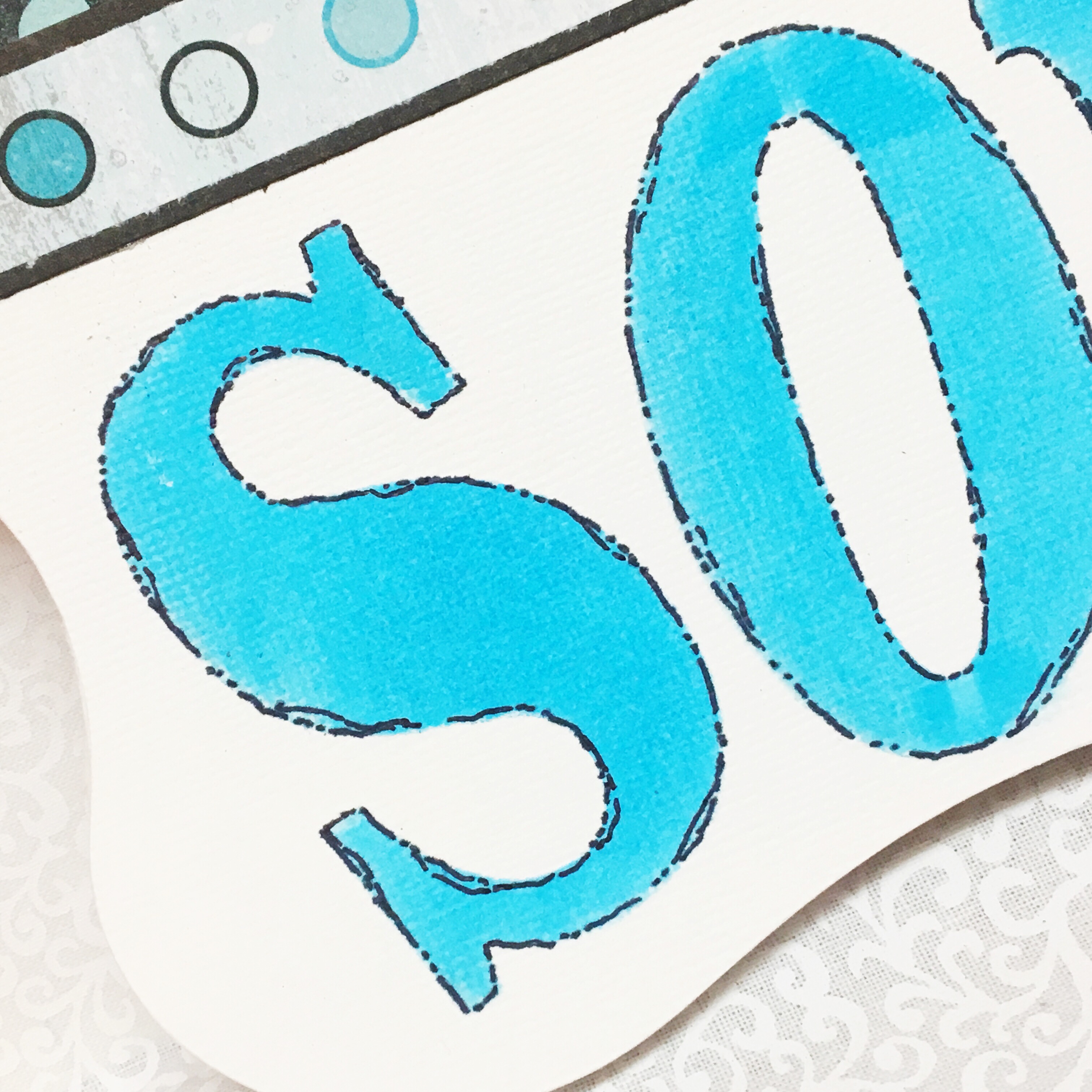 Next, I stenciled "Sonni" in blue ink on the white cardstock using abc Lower Case Letter Stencils and added a loose outline in black pen.