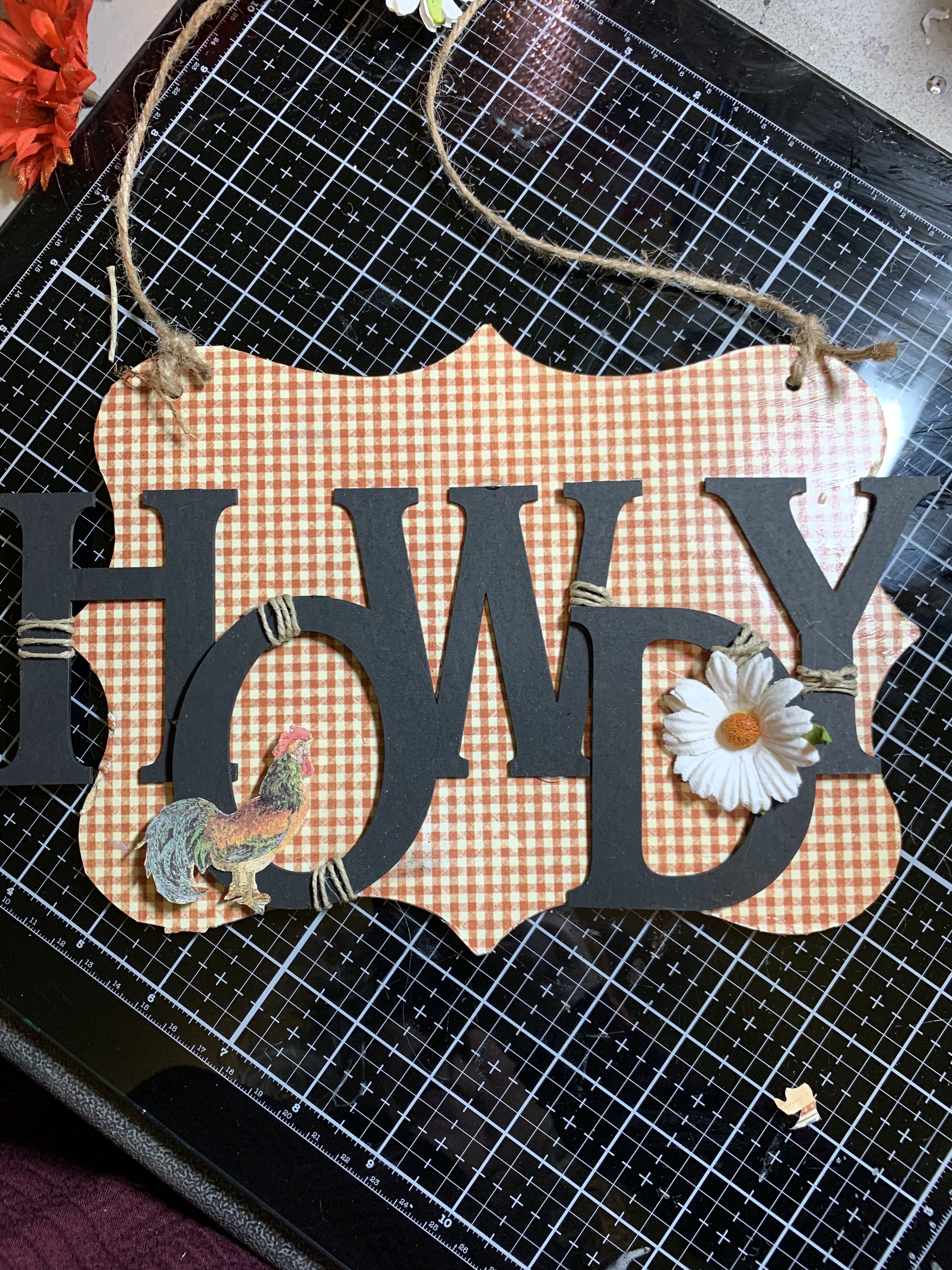 I painted my Chipboard HOWDY with black paint and then wrapped jute around an accent point on each letter. I adhered the letters to my pallet and added a flower for accent.