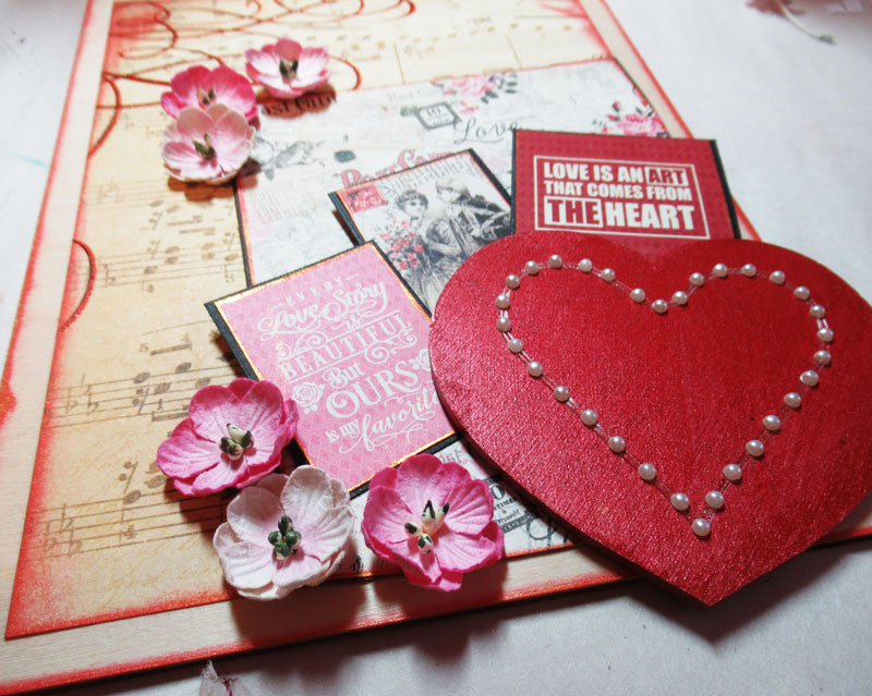 Then I proceeded by adding an assortment of elements from tags to flowers and a wood heart which I painted with red paint. A pearl heart was added on top of the wood heart.
