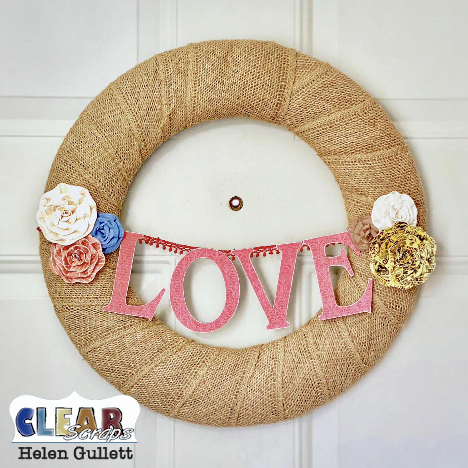 On this wreath, I use the new Love Large Chipboard Embellishment. For the wreath base is a paper mache wreath base that I wrapped it with burlap ribbon. I used glue gun to secure the ribbon on the wreath base.
