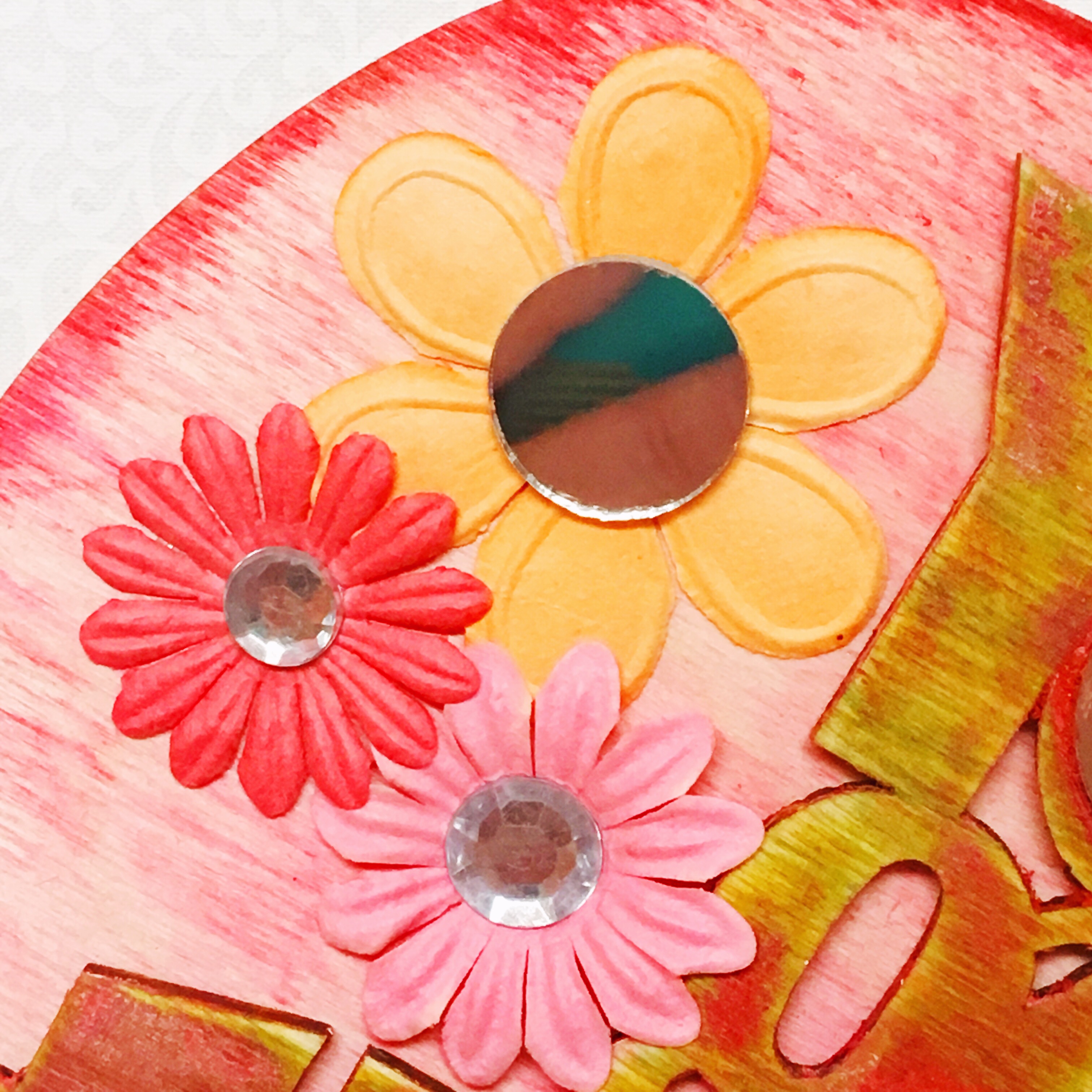 other products: ColorBox: Lemon Drop Spritz and Fruit Punch Dye-Stress Ink, TCW Raspberry Sorbet Paint, Beacon: Mixed Media Glue, Orange and Pink Flowers, Small Mirrors, Clear Rhinestones and Pink Satin Ribbon