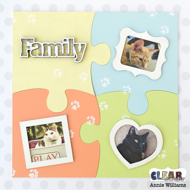 Hi everyone! It's Annie, and today I'm sharing a tutorial to make some fun home décor using brand new wood frames, wood puzzle shapes, and shakers from Clear Scraps. The possibilities are endless when customizing this Extra Large Square Wood Puzzle Shape, but I used mine to honor my beautiful shelter cats as family.