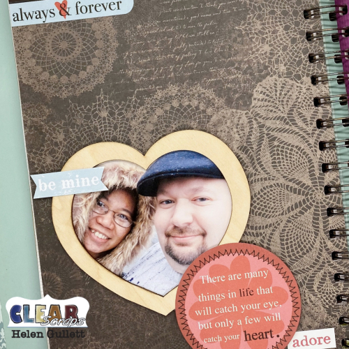 Hello everyone… It's Helen here. I am still working on our memory scrapbook album and I like the SMASH book size. It is not too big but also not too small for a scrapbook. Today I have a clean-and-simple SMASH Scrapbook page to share with you. This is a quick to scrapbook page to make using this Wood Heart 2pc, one of the new Wood Frame Shapes on my page as the frame.
