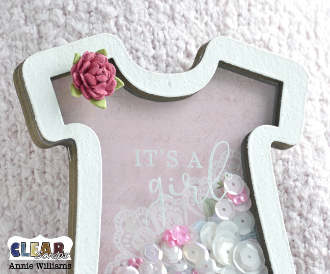 Hi everyone! It's Annie, and today I'm sharing a quick tutorial to make this fun baby onesie shaker pin perfect for baby showers and moms-to-be. The brand new Mini Shaker Onesie from Clear Scraps is super versatile and can be used for gift tags, cards, and scrapbook pages as well!