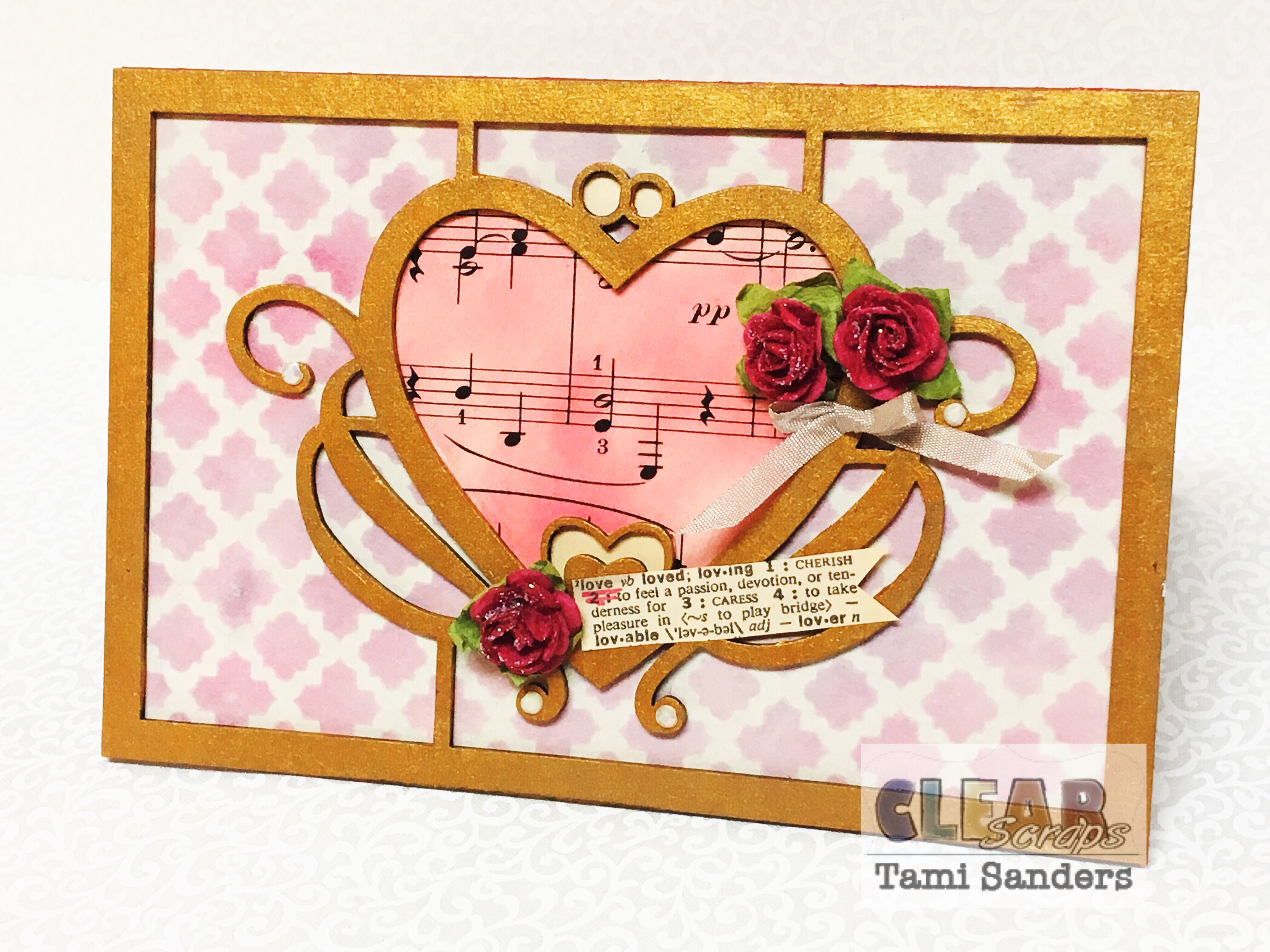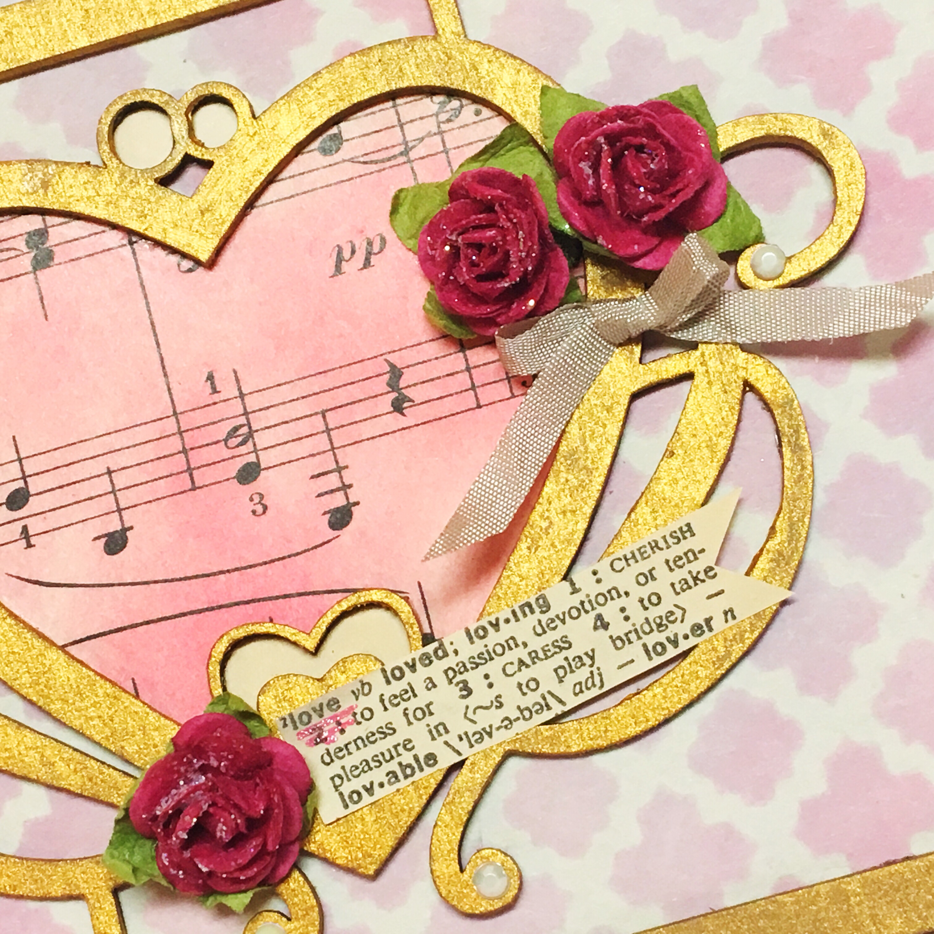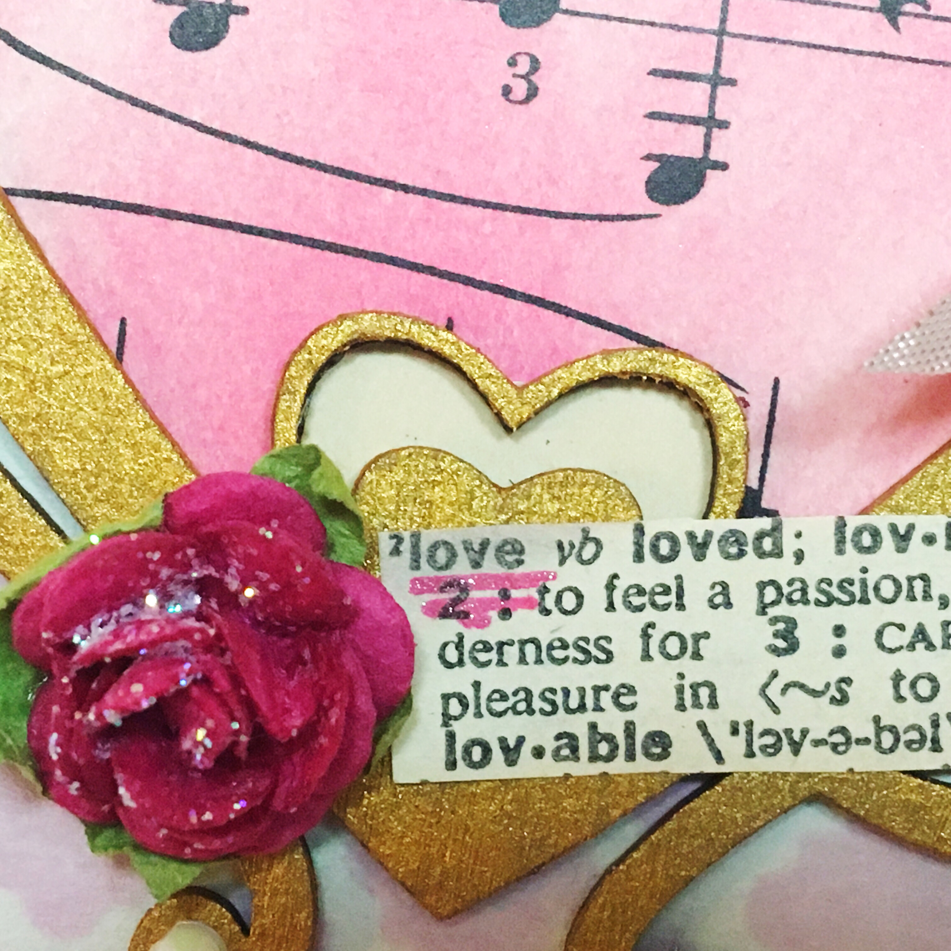 other products: TCW Gold Paint, ColorBox DyeStress Inks: Fruit Punch and Aster and Frost Smooch Glitz, Beacon: Paper Crafts Glue, KingArt Pink Glitter Pen, vintage: music paper, "love" definition and narrow mauve rayon ribbon, manila paper, coordinating cardstock, small pink roses and tiny iridescent rhinestones