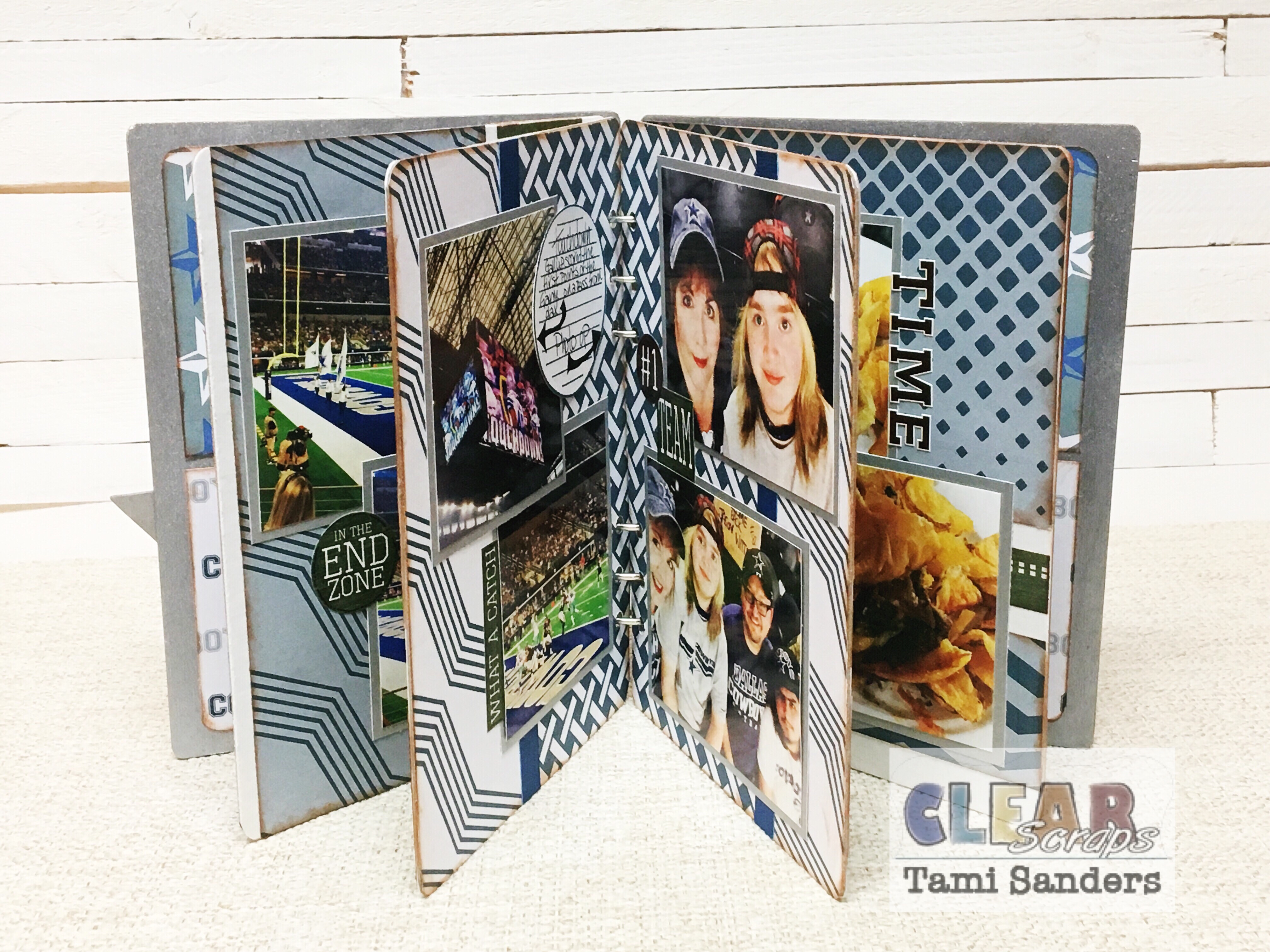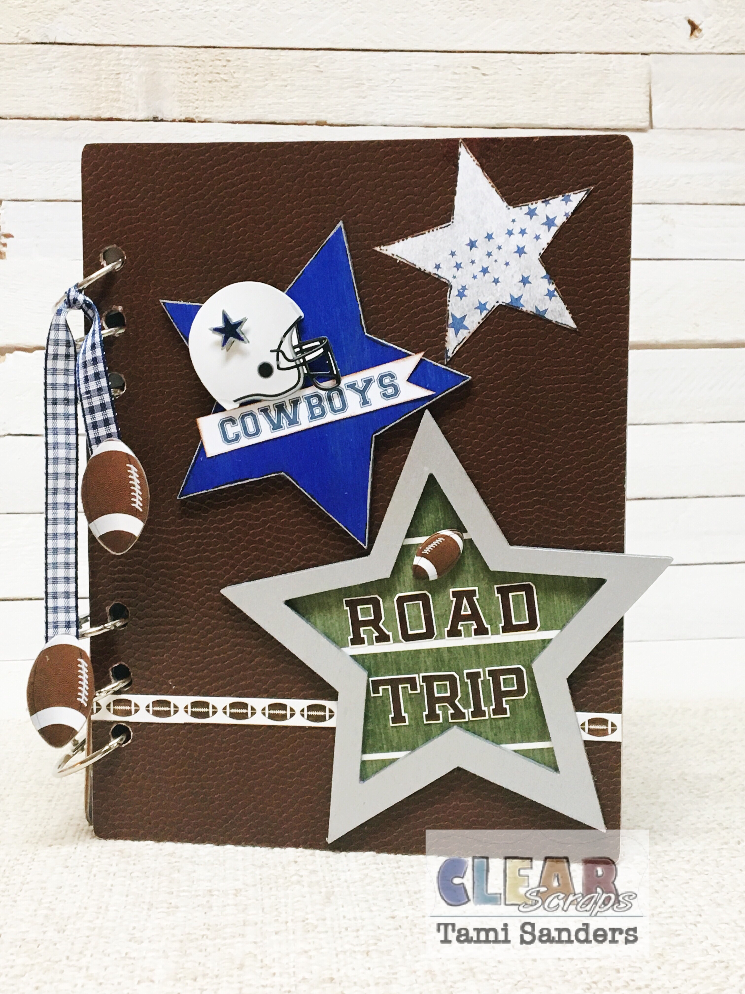 The Wood Albums by Clear Scraps can be painted, inked, stained or covered with paper to embellish them. I used a combo, I painted the covers silver, then embellished with printed paper. I separated the 2 Piece Wood Star and used the pieces separately. I painted the larger one silver and backed it with printed paper to hold part of my book title. For the smaller star, it was painted blue and embellished with a cowboys helmet and team name.