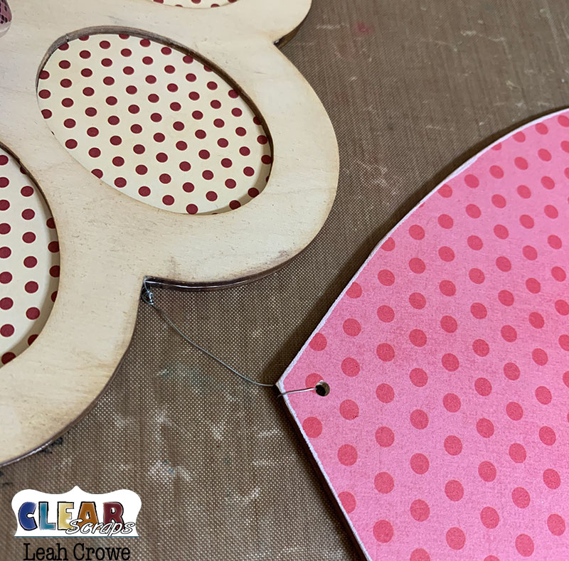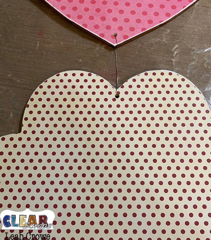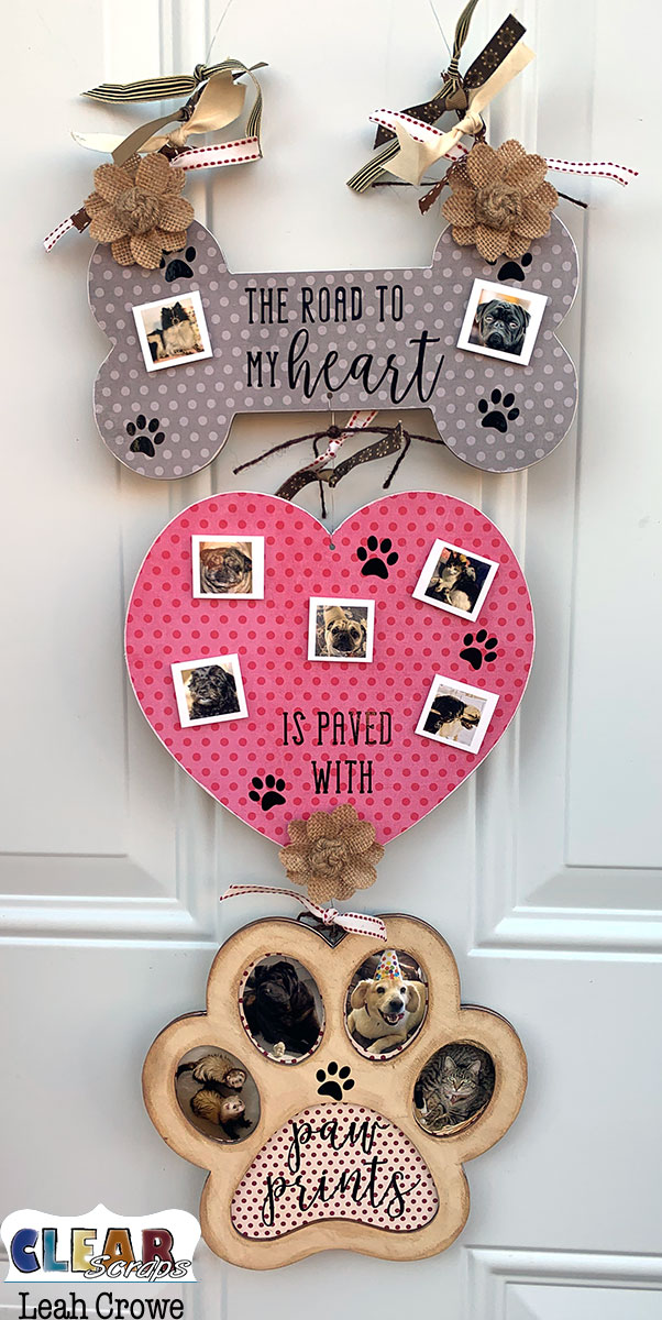 Using a Crop O' Dile I punched holes at the top of the bone, the center bottom of the bone, the center top of the heart, the center bottom of the heart, and center top of the paw print back (before you adhere the frame on)