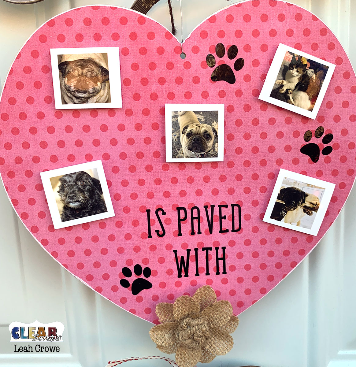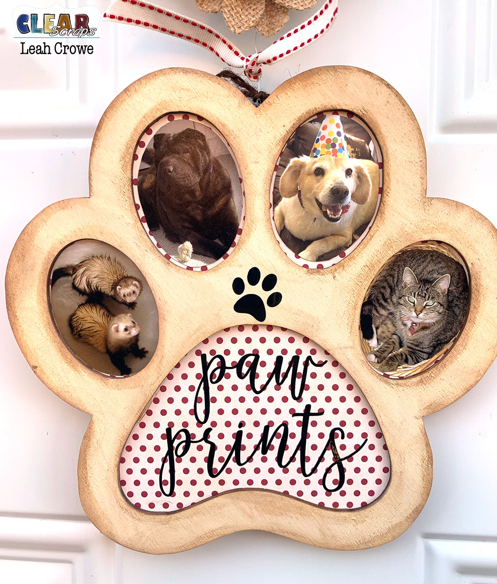 Before I adhered the paw print frame, I used the frame so I could place the vinyl exactly where I wanted it by hinging the vinyl to the contact paper. Once I had the phrase positioned exactly where I wanted it, I was able to remove the frame and apply the vinyl without it moving on me. I then adhered the frame and place my photos inside the paw prints.