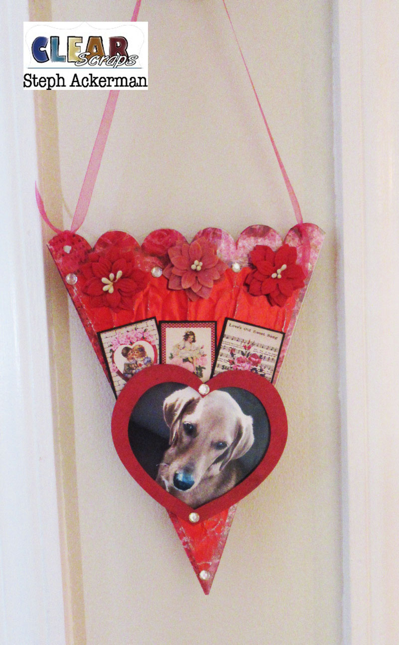 Using one of the new wood heart shapes, I painted it, then cut a photo to fit behind it. The heart was adhered to the Banner overlapping the tags. To finish, gemstones were added around the Banner.