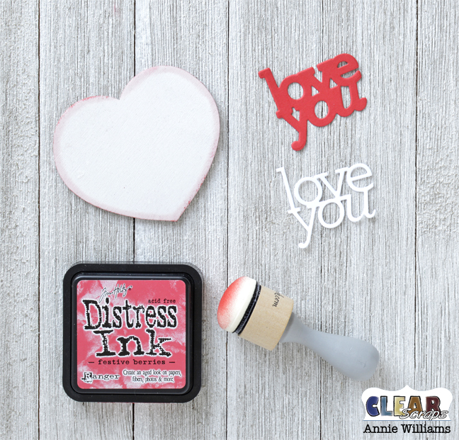 Meanwhile, ink the edges of the small heart shape with red ink for a little interest and finishing. Die cut a sentiment out of white and red cardstock and adhere them together using liquid glue.