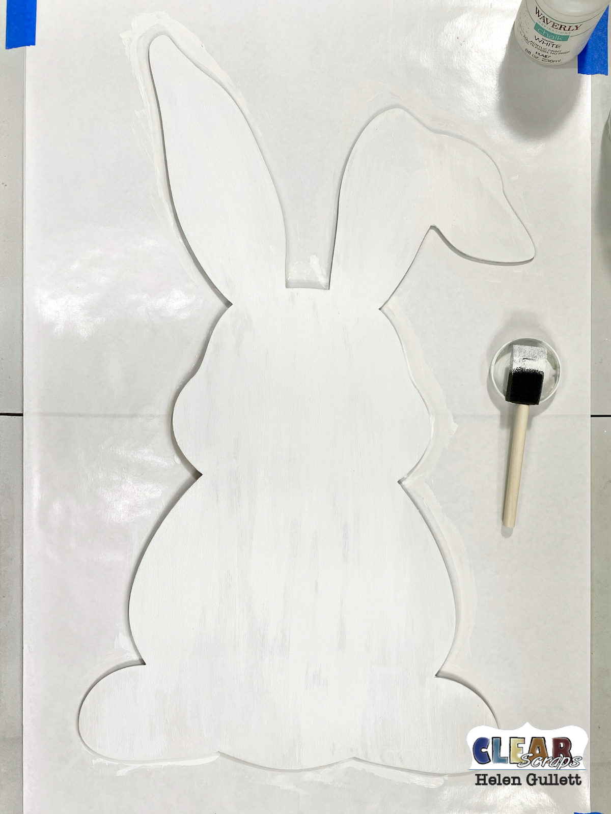 I applied 2 coats of white chalk acrylic paint with foam brush all over the XL Wood Bunny. I also painted the edge of the wood. I let the paint dried in between the coats.