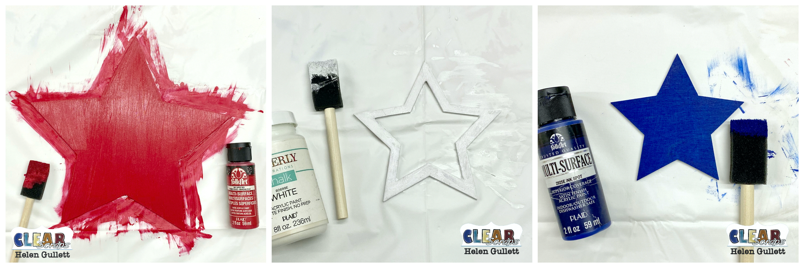 Using foam brush, I painted the Star wood shape with red multi-surface acrylic paint. I painted the Star wood frames with the same white chalk paint and blue multi-surface acrylic paint.