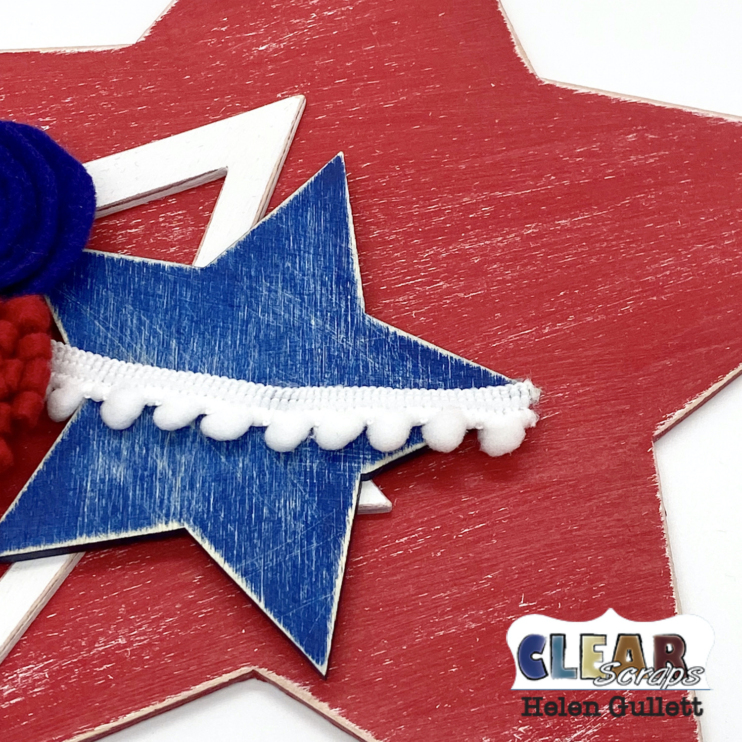 I added the white pompom ribbon on the wood using Beacon 3-in-1 glue.